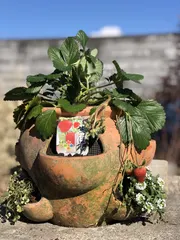 苺の植え付け♪ 苺苗をストロベリーポットに植え付け🍓 しばらく放置してたらポットは割れていて😭接着剤でくっつけました。大丈夫、まだまだ使える😊 下の方はアリッサムやらクローバーなどを植えときました♪ 春になったら苺🍓が収穫できるかな?