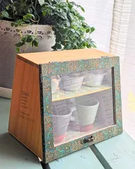 カフェ風ショーケース [ミニ] DAISOのウッド収納BOXをマスキングテープでアレンジしました💕 こちら再投稿になります。 大きく見えますが、幅20㌢✕奥行12㌢✕高さ14.5㌢のミニサイズです。 金具をはずして、丁寧にマスキングテープを貼り、ビンテージワックスで仕上げました⚒️ 横には、