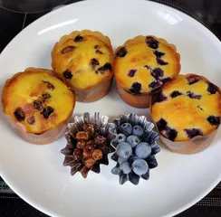 収穫したフルーツで米粉マフィン ■作品内容自宅で育てているデラウェアとブルーベリーを使って、米粉マフィンを焼きました🧁左:レーズン、右:ブルーベリー■こだわりポイントデラウェアはオーブンで乾燥させて干しブドウにし、アロニアのリキュールに漬けました。ブルーベリーは採りたての実をたくさん入れました。とても美味しいマフィンが出来ました❣