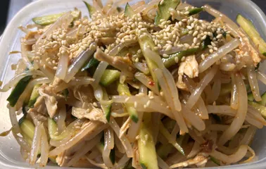 さいた鶏胸肉をモヤシは根をキレイに取ってみました。きゅうりも入れて🥒いつもは入れない自家製豆板醤も入れてみました🤭だからほんのり赤く市販のとは味が違うのでちょっとぉ〜旨しです☺️