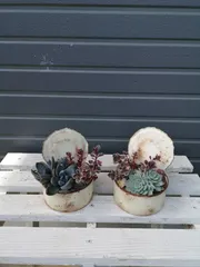 多肉寄せ植え鉢 一緒に参加した方の鉢と(o^^o)今日は素焼き鉢にステンシルして多肉植物の寄せ植えをしました。初ステンシルで失敗しましたが(⌒-⌒; )多肉話に花が咲いちゃいました(^^)