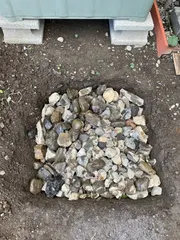 土中に隠す その6 少し前に掘っておいた穴に火成岩、コンクリ端材、石の順に埋めて隠しました。埋める前に少し穴を広げたのは、結果的に正解でした。↓石を埋め始めたところ。↓2度と掘り上げることは無いと思います。