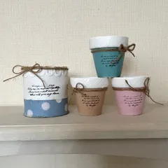 リメイク鉢リメイク缶🎶 小さな2号鉢をリメイクしました😊鉢の上部はモルタル風塗料で、下はザラザラベースの上に塗料を塗って、seriaのスタンプを押しました✨リメ缶はバイカラーで水玉模様に❣️seriaのスタンプの文字が可愛いです❤️