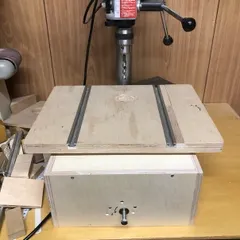 昇降台 その2(動力を直角に伝える仕組み……だったのですが) ボール盤のビットを交換する時、あと5ミリ間隔があいていれば交換できるのに……! なんて思ったことはないでしょうか? 空いていないため、支柱の後ろへ手を回し、ハンドルを回してワークテーブルを下げ、固定し、ビット交換する……という手間が生じてしまいます。 そしてもう一点。幅の広い天板と背板を接