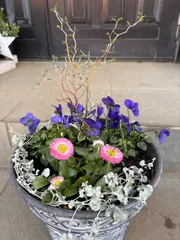 少しお安いビオラで寄せ植えしました。ピンクのデージーとビオラは今回購入。あとは家に合った苗で🌱