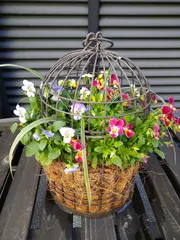 鳥かごの寄せ植え 去年のGWSを思い出しながら植えました。鳥かごへの植え付けはやっぱり難しいです💦だんだん寒くなってくるのでカラフルにしました☺️見ていると元気になります!