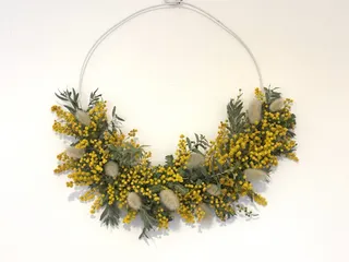 ミモザの小さい花束が買えたのでリース作りに挑戦。花が少ないのでアカシアブルーブッシュの葉とラグラスバニーテールのドライを足して。リース台も使わず、太いワイヤーにくくりつけ😆ハーフでも可愛いから良し!