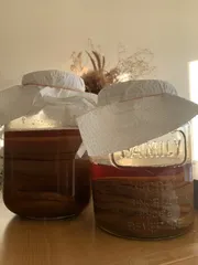 我が家のコンブチャです!紅茶キノコのがわかりやすいかな?娘の置き土産を私がお世話してます😆今日は継ぎ足ししました!初めて見た時はこれは大丈夫なのか?と思いましたが何だか飲むと腸の調子がいいです👍