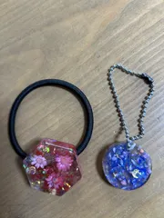 レジンでヘアーアクセサリー レジンアクセ作りに行ってきました😄髪ゴムとキーホルダーにしました🩷初めてだったので結構色の具合や中のキラキラ具合考えながら作るの大変でした出来上がりを見ると可愛い🩷感じで良かったです😄🎶