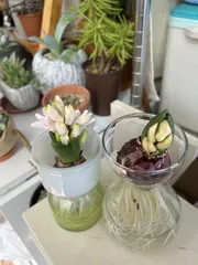 水栽培のヒヤシンス 球根を購入して育てているヒヤシンス、ようやく咲き始めました。日当たりのいいところに置いているので日に日に大きくなるのがわかります。もう少しオレンジがかったピンクと思ってましたが、優しいピンクです。それはそれで嬉しい。☺️ 芽出しで購入したヒヤシンスはすでに花も終わり、葉が元気に育ってま