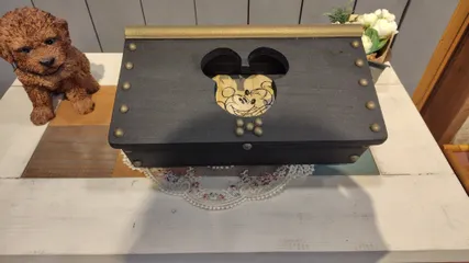 小物入れにもなるアンティーク風ティッシュケース 今日は、午後から久々のWS🤗店舗オリジナルの作品🤗前回開催は予定が合わず🤣今回は作れました🤗その時からジグソーで出来るか解らないけど、ミッキー風にしたくて🤭リメークシートも持参してくり抜きからミッキーが見える様に仕上げたくて😁頑張りました😵💫中のシートは、こんな感じ🤗そして、今日はこの後にまだミッ