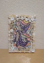 100均商品の、大人のステンドグラス風シール塗り絵を、白く塗った板に貼りました。本当は貝殻や珊瑚を周りに貼りたかったのですが…。服を処分する時に取っておいたボタンを使います。白系をランダム(適当に)貼ってみました。↓板の裏側も利用しました。こちらはポピー柄に茶系のボタンです。季節で裏表入れ換えようと