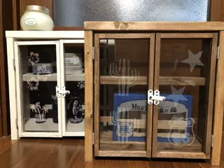 網戸扉付き飾り棚 カインズワークショップで 網戸扉の飾り棚を作りました ブラウンはワークショップで ホワイトは自宅で苦戦しながら 何とか完成💦よく見るとガタガタ💦 ホワイトはコスメを ブラウンはDIYの小物を飾ろうかなぁ