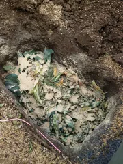 家庭栽培で出た残渣を畑の隅に穴を掘って埋め米糠、籾殻くん炭、を層にして入れて踏み固めて上から土を被せて、後は1ヶ月に1回程度、掘り返して空気を入れてあげます自然の、サイクルでごみも、減り堆肥で作れて一石二鳥。