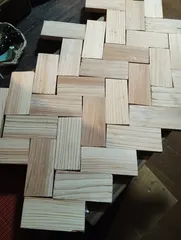 ヘリンボーンおさらい ジグソーで切ってならべてみました!ストレートの刃で最初切ったのですがバリが結構でてしまい曲線切りの刃のほうがいくらかバリが少なめでしたバリをヤスリがけしてからならべてみました😊