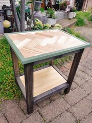 ヘリンボーンサイドテーブル WS直後。ヘリンボーンサイドテーブルを作成しました😆天板蜜蝋ワックス、枠DAISO塗料ミリタリーグリーン、脚ブラックステイン。特に大きな失敗もなく、4時間で終了しました👍サイドテーブルとして使おうと思ったけどリビングのテレビ台横に置いたらピッタリ✨ ここには以前WSで作成した引き出し付きサイドテーブ
