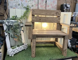 肘つきミニベンチ 昨日は午前と午後で1作品ずつ作りました。午前は肘つきミニベンチ。材料の数が多くて、これがどっち側とかややこしい😅ダボもしっかりやって、時間オーバー、次のWSギリギリでお昼休憩しました。リカちゃんの肘つきミニベンチとともに