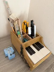 ピアノ型プランターカバーを活用しました! みんなに質問で、ピアノ型プランターカバーの活用法を質問したロムです。端材で中を4つに区切りました。後々、使い方が変わることがあるかもしれないので、区切りの板は取り外せるようにしました。筆やペンなど、種類毎に立てて入れることができました。小さいカッターやピンセットは、行方不明になることが多いので、これ