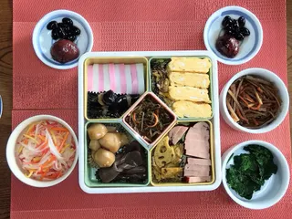 ■作品内容厚焼き玉子、レンコンと豚肉のカレー粉炒め、里芋の煮物、ひねりこんにゃくの煮物、松前漬け、きんぴら、4色なます、ほうれん草の茹で菜、栗の渋皮煮を手作りし購入したものも合わせて盛り付けました■工夫ポイントなるべく手作りを心がけ彩りも考え盛り付けました豪華ではありませんが美味しかったです