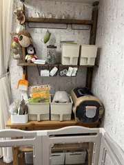 うさちゃんですが手作り棚 ペットグッズが増えてしまいケージの隙間にまとめて置ける棚をDIYしました 棚1×4 柱2×4 アイアンアーム2本下のテーブルは子供達の使わなくなった勉強机をリメイクしましたなかなか良く出来たと思います