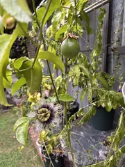 実家の軒下のパッションフルーツ これは今日の3時過ぎの写真ですこんな時間まで咲いています知らないうちに実をつけていてびっくり🫢 今日あたり日中でも涼しくなってきました。未だ温かい場所への避難は考えていませんが、大きくなりすぎて、1階の軒下をはうように伸び放題となった鉢をどの様に温室へ運び込めばいいのしょうか?伸びた枝をカ