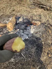 焚き火で焼き芋🍠 ■材料薪さつまいも ■作り方さつまいもは軽く水洗いし濡らしたキッチンペーパーで包み更にアルミホイルで包みます。焚き火が弱くなってきた所に炭の下にアルミホイルを敷いてその上に包んだ芋を並べ、更にアルミホイルを敷いた上に炭を乗せます。芋の大きさにまよりますがおよそ10分、その後焚き火のフチに移