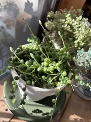 グリーンネックレスにたくさんつぼみがついています。花が咲くと株が弱るかもと調べたら、グリネは強いので大丈夫🙆、花を楽しんでとチャッピーさんが言ってました😆光の方を向いている姿が可愛いい🥰です‼️