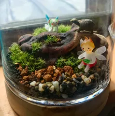 苔テラリウム 苔テラリウム作ってきました〜思ってたより入れ物が大きくてびっくり😳✨ ワークショップでフィギュアは🐢を選びましたがお家にあったガラス細工の🧚🧚♂入れてみました