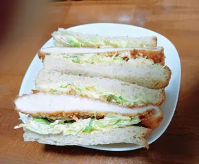 チキンカツサンドイッチ🥪 レタス、キャベツ、人参、紫玉ねぎをマヨネーズであえてサンドしました。ボリュームたっぷりで美味しかったです。MCTコーヒーをホットミルクで溶かしました。デザートはヨーグルトに柿、リンゴ、キュウイです。