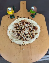 デザートピザ cookingfun 2枚目はデザートピザです😉🎶2枚目なのに1枚目よりも伸ばすのが下手くそでちょっと四角ばってしまいました😅トッピングはチョコソース、カットバナナ🍌、アーモンドスライス、粉糖ですこちらは先生に焼いていたきました😉デザートピザ🍕も美味しくスイーツですね💕🎵先生、スタッフの皆様、サファイアさんお世話になりあ