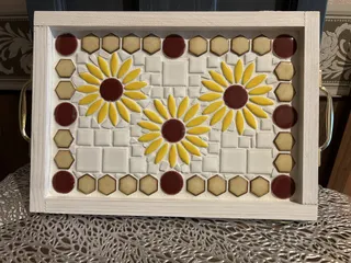 モザイクタイルと木材でカフェトレイ② 今日の午前はMyストアでモザイクタイルと木材でカフェトレイの2つめ目を作ってきました🎶今回はひまわりバージョンです🌻前回の紫陽花の時に目地の部分が多すぎて少し凹んでしまったのでタイルを割って入れてみました😅思ったように割れなくて変な形ばっかりになってしまいました💦
