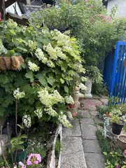 柏葉紫陽花が見事です。 ここの子は、挿し芽から成長しました。 もう15年以上になりますかね。 毎年強剪定はしているのですが、又此処までおおきくなって、側に置いてある花ぐるまの花を覆ってしまうので、その花ぐるまの中々花達は、太陽が当たらないので、段々弱っていってダメになってしまいますね。トホホ‼️ですけど、仕方がありません。