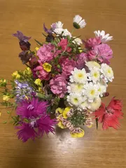75歳の湯婆婆さんの作品です(^_^)v 先週から我が家に1人でお泊りに来ていた妻の母です。通称、湯婆婆さん今日も私達夫婦は社畜の如く仕事に出た後1人でマサミホガーデンに咲いている花をチョキチョキしてテーブルに花を添えてくれてた様です♪遠目に見えているのが湯婆婆さん75歳です。別角度からパシャリ沢山のお花を摘み取りましたねー😅色合いとかバラ