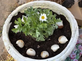 チューリップの植え込み♪ 駆け込みでお安い球根を買ってきました。真ん中にノースポールを植えて。華やかな色のチューリップ、咲くのが楽しみです😊