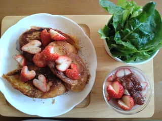 朝食で豆乳フレンチトースト 子供のペットボトルを片付けて、ブルーになったのでしょうか?いちご🍓をハート💖に飾り切りしたくなって、ハートに。トーストにシナモンをかけたつもりが、クミンでしてた。慌てて味を見ると、いけるやん。クミンをそのままに、シナモンをトッピング。蜂蜜も。飾り切りの残りはヨーグルトに入れ、いちご🍓ジャムも。昨日の