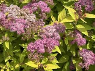 シモツケ ファイヤーライト♪ シモツケが咲きました。たくさんの蕾がついてます。花後は少し枝をカットすると赤っぽい色の新芽を楽しめます🌱