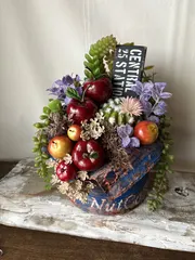 久しぶりに投稿です😆 手作りをするスイッチがはいったのですが今回はリメ缶とフェイクグリーンのアレンジにしました。 リメ缶は前にずーっと前に作ってあったものでちょっとだけクリスマスを意識して赤いりんごを飾ってみましたこのりんごはクリスマスオーナメントです🍎(100円ショップのもの)