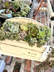 セダムもモリモリに 木箱プランターの寄せ植え💕周りのセダムもモリモリになって良い感じ🥰