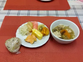 月に1度のカミンさんとの夕食です😊🎶ふりかけ入りのおにぎり、秋になって初めての豚汁(豚肉、大根、大根の葉、ニンジン、レンコン、キャベツ、ゴボウ、里芋、豆腐)厚焼き玉子、焼き鮭赤かぶ、玉ねぎ、新生姜のらっきょう酢漬けデザートはお友達から頂いた柿とキウイフルーツてす🩷