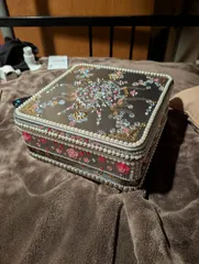 前に出したお菓子の空き箱をデコってみた、の続きです。 前回は蓋のところを加工しましたが、今度は身の方の加工です。前回のちょこっと残ってたラインストーンと新たに買ってきたラインストーンを合わせて作ります。まず縁をやってから、、、桜柄の布をつけてラインづくりをして、あと残った部分をラインストー
