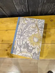 本型小物入れ 今日のワークショップは2本同時並行。こちらは本型小物入れです。前回違う壁紙でやってみて、揃えたいと思い、お願いして同時並行で行いました。前回の壁紙が青系だったので、今回は白系にしました。で、ちらっと見える色に新色のブルーのパリジャンブルーにしました。塗料との取り合わせもうまくいき、完成に満足です。今