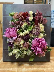 以前ワークショップで作った作品です。木材には丸みを持たせて、アイアンチックに着色。オアシスを一面に詰め、ドライフラワーを無心で詰めました!