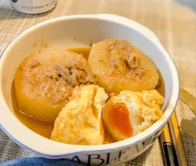 大根と巾着玉子の煮物、シーチキン入り シーチキンが良いだし汁に! 工程をメモしよう(任意)①面取した大根6切れは、米の研ぎ汁で下茹でする(圧力鍋30分)粗熱が取れたら軽く水洗い ②巾着玉子4個(油揚げを袋状にし全卵を入れ楊枝でとじる) ③シーチキン汁ごと一缶 ④だし汁(水200cc顆粒だし小さじ1)、砂糖大さじ1、しょう油大さ