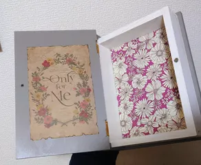 レトロな本型小物入れアレンジ✨ ■材料ダイソー強力マグネット セリアマスキングシート(左)カットクロス その他小さい7ミリ程度のビス1つ両面テープ瞬間接着剤厚紙(11.5×17㌢)修正液6ミリドリルビット ■作り方底面厚紙の表裏に両面テープを貼るカットクロスをシワが寄らないように貼り付けて