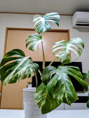 斑入りモンステラ イベントのオークションでお安く手に入れた斑入りモンステラ😍 半年程たち、どうしても白い部分が茶色になってしまって難しい💦
