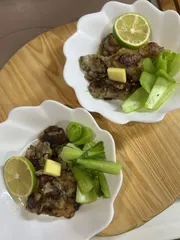 牡蠣のソテー 寒くなり出し牡蠣🦪が出回ってきだしました 牡蠣を酒で下味を付け米粉をまぶしてバターでソテー味付けは粗挽きコショウとバターだけです レモンの代わりにいただいたスダチの輪切りを添えて美味しかったです♪♪ スダチ第二活用❣️
