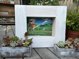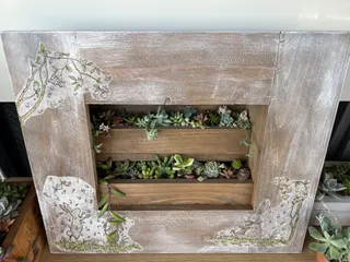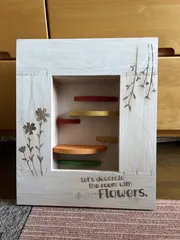 フラワーフレームアレンジpart2 デコパージュをしてから棚を設けて、多肉植物を植えました。小さな多肉ばかりを使ったので、ちょっとしょぼい感じがします。垂れ下がるタイプがカッコよく伸びてくれたら少しはいい感じになるのかなぁ?!(デコパージュが下手すぎ😅恥ずかしい🫣)
