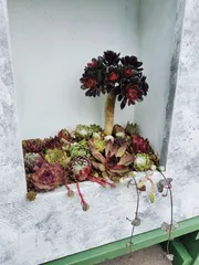 センペルビウムを沢山ゲットされていたんですね😃 モルタル塗料のフラワーフレームの風合いに、可愛い寄せ植えが映えますね❣️ 地植えの多肉さんも立派ですね。 七福神の子株ちゃんも可愛い💚頑張ってね〜💪