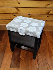 収納付きスツール お気に入りの布で収納付きスツール作ってきました💖開けやすいようベロ(つまみ)挟みました😁(以前投稿で見たので真似させていただきました🙇)座るとゆうよりも、ソファーに座った時に足を置く為に😊おっきいお尻が乗ったらちょっと可愛そうだし🤣中には寝る前に塗るハンドクリーム入れました😌楽しかった〜🎵😆🎵😆🎵