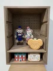 今年初のWSで高さ自由ラックを作ってきました!背面が有孔ボードなのでフックをつけて吊すことも出来ます👍とりあえずダッフィー達を吊るしてみました♡
